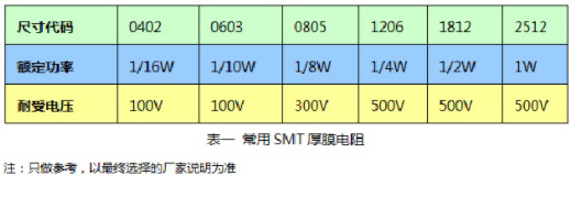 如下所示表一是比較常見SMT厚膜電阻器的參數(shù),終選型時(shí)需與選購器件的廠家核實(shí)(此表來源于網(wǎng)上):