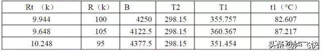 T2:常溫25°C,上式中T2=273.15+25=298.15;B:4250±3%;R:25°C時的電阻值,100k,計算出的T1值也是加了273.15后的值,因此下表中t1=T1-273.15,是攝氏度。Rt:溫度變化后的阻值,10k,9.704k,10.304k,見上表