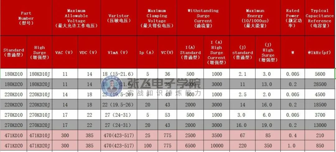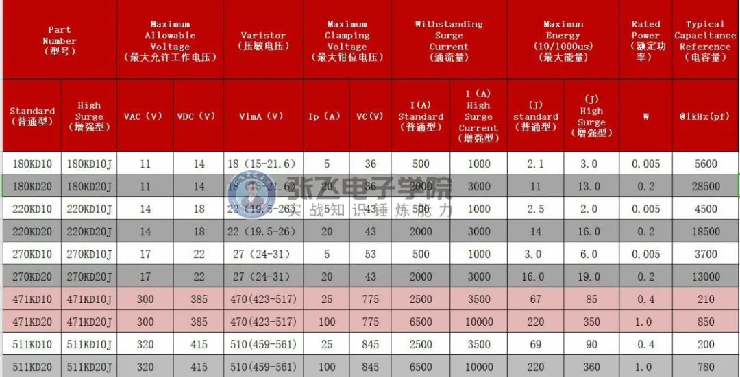 列如我們常用的471 它的大允許電壓AC300V DC385V同時通流量也是需要注意的,一般規格書上給出來的通流是1次的通流量,我們在選取的時候一定需要留有很大的余量,通流量是我們選擇直徑的依據,如果一個417KD10 的壓敏電阻在計算的時候剛好接近規格書上的通流量2500A,我們可以選取兩個來并,如果空間不夠的時候我們可以選擇加強型的。