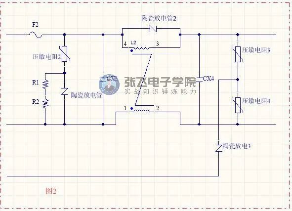 共模電感上并聯陶瓷放電管與L相與N相對大地跨接壓敏電阻串陶瓷放電管一樣的作用,有時可能只會出現一組電路。作用都時用來防共模雷擊。(文章源于張飛電子學院,如有侵犯,煩請告知)