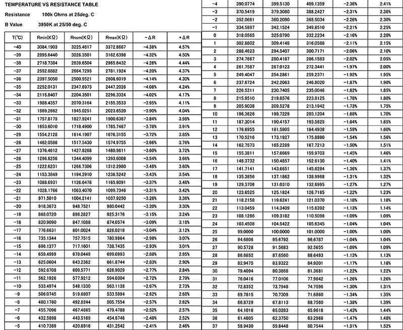 通過100K值對照表,用戶可以快速定位所需溫度范圍內阻值接近目標值的熱敏電阻。這對于設計師和工程師來說非常重要,因為它能幫助他們選擇合適的電阻來滿足特定溫度傳感器或電路的要求。