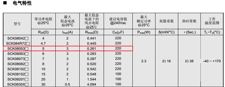 熱敏電阻: VT 熱敏電阻型號(hào): SCK08053MSY 熱敏電阻片徑: Φ8mm 零功率電阻@25℃: 5Ω 工作溫度范圍: -40℃±150℃ 儲(chǔ)存溫度范圍: -40℃±85℃