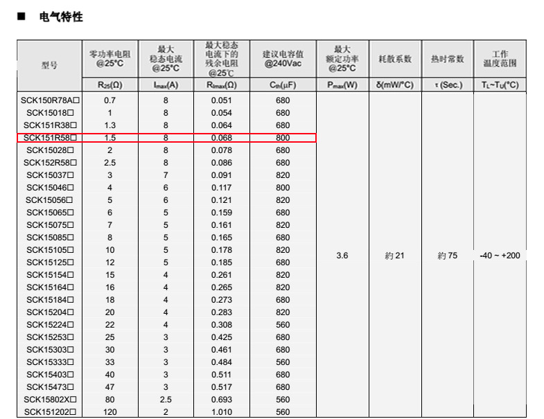 熱敏電阻: 穩騰 熱敏電阻型號: SCK151R58MSY 熱敏電阻片徑: Φ15mm 零功率電阻@25℃: 1.5Ω 工作溫度范圍: -40℃±200℃ 儲存溫度范圍: -40℃±85℃