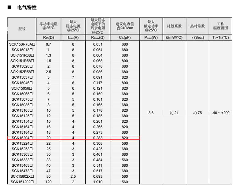 熱敏電阻: 穩騰 熱敏電阻型號: SCK15204MSY 熱敏電阻片徑: Φ15mm 零功率電阻@25℃: 20Ω 工作溫度范圍: -40℃±200℃ 儲存溫度范圍: -40℃±85℃