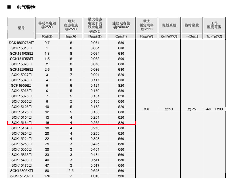 熱敏電阻: 穩騰 熱敏電阻型號: SCK15164MSY 熱敏電阻片徑: Φ15mm 零功率電阻@25℃: 15Ω 工作溫度范圍: -40℃±200℃ 儲存溫度范圍: -40℃±85℃