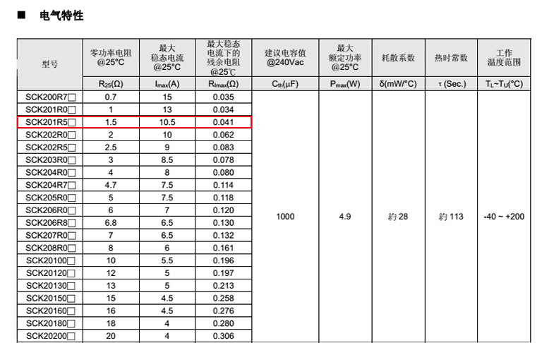 熱敏電阻: 穩騰 熱敏電阻型號: SCK201R5MSBY 熱敏電阻片徑: Φ20mm 零功率電阻@25℃: 1.5Ω 工作溫度范圍: -40℃±200℃ 儲存溫度范圍: -40℃±85℃