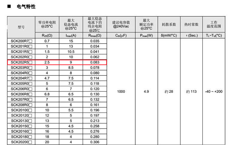 熱敏電阻: VT 熱敏電阻型號: SCK202R5MSY 熱敏電阻片徑: Φ20mm 零功率電阻@25℃: 2.5Ω 工作溫度范圍: -40℃±200℃ 儲存溫度范圍: -40℃±85℃