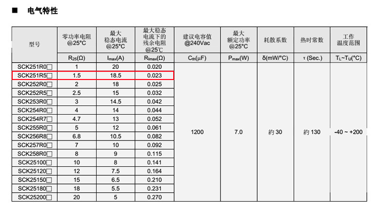 熱敏電阻: VT 熱敏電阻型號: SCK251R5MSY 熱敏電阻片徑: Φ25mm 零功率電阻@25℃: 1.5Ω 工作溫度范圍: -40℃±200℃ 儲存溫度范圍: -40℃±85℃