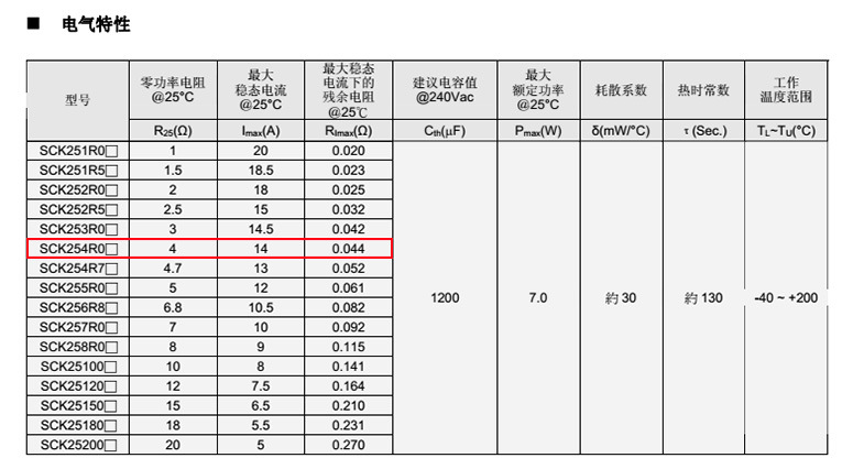 熱敏電阻: VT 熱敏電阻型號: SCK254R0MSY 熱敏電阻片徑: Φ25mm 零功率電阻@25℃: 4Ω 工作溫度范圍: -40℃±200℃ 儲存溫度范圍: -40℃±85℃