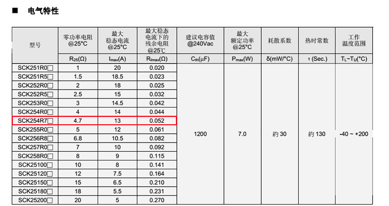 熱敏電阻: VT 熱敏電阻型號(hào): SCK254R7MSY 熱敏電阻片徑: Φ25mm 零功率電阻@25℃: 4.7Ω 工作溫度范圍: -40℃±200℃ 儲(chǔ)存溫度范圍: -40℃±85℃