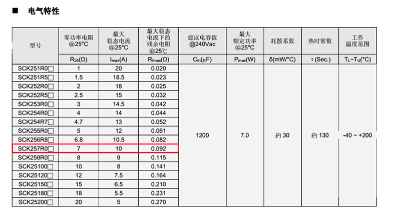熱敏電阻: VT 熱敏電阻型號: SCK257R0MSY 熱敏電阻片徑: Φ25mm 零功率電阻@25℃: 7Ω 工作溫度范圍: -40℃±200℃ 儲存溫度范圍: -40℃±85℃