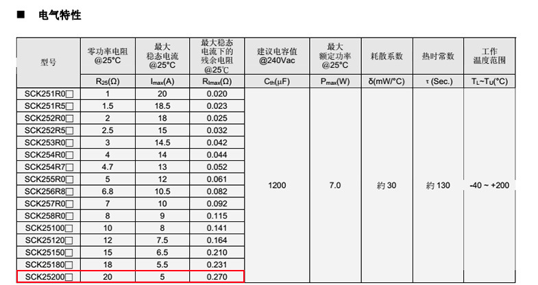 熱敏電阻: VT 熱敏電阻型號: SCK25200MSY 熱敏電阻片徑: Φ25mm 零功率電阻@25℃: 20Ω 工作溫度范圍: -40℃±200℃ 儲存溫度范圍: -40℃±85℃