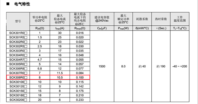 熱敏電阻: VT 熱敏電阻型號: SCK308R0MSY 熱敏電阻片徑: Φ30mm 零功率電阻@25℃: 8Ω 工作溫度范圍: -40℃±200℃ 儲存溫度范圍: -40℃±85℃