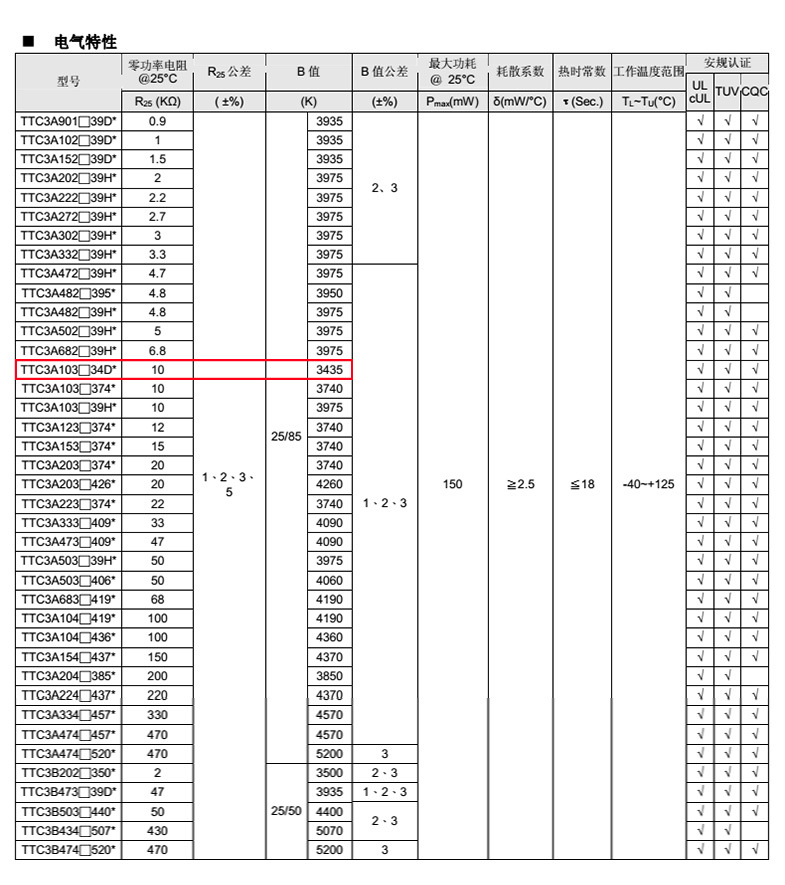 10K熱敏電阻TTC3A103F34D1EY
