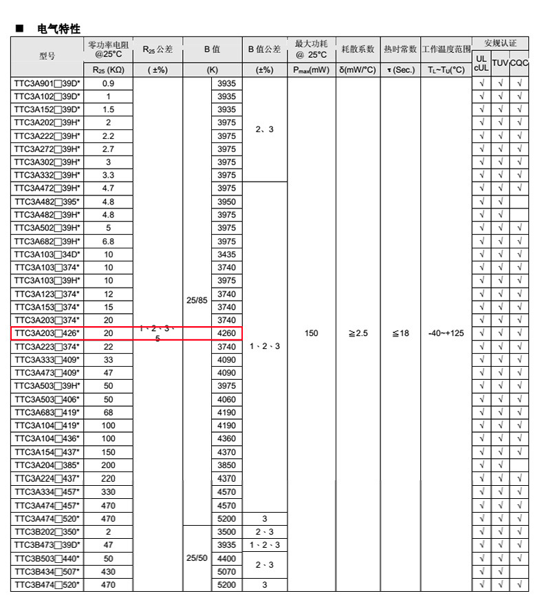熱敏電阻型號::TTC3A203F462EY |